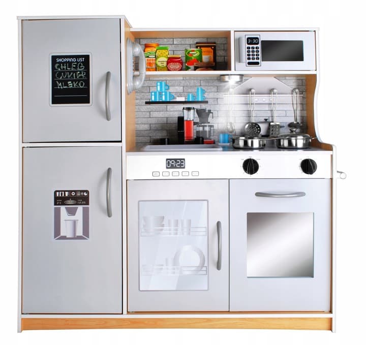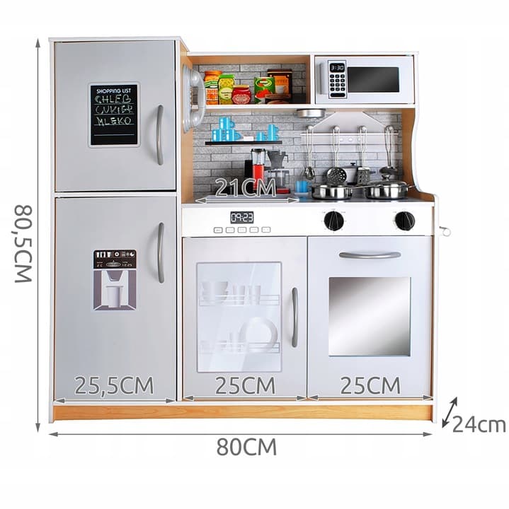 ✔️ kuchnia oferuje wiele możliwości zabawy – wszystkie drzwiczki są otwierane, a dziecko może korzystać z takich funkcji, jak mikrofalówka, piekarnik, zmywarka, lodówka, palniki, telefon, szafka, półka, uchwyt na ręczniki czy zlew, co zapewnia długie godziny kreatywnej zabawy, rozwijając wyobraźnię i zdolności manualne małego kucharza!