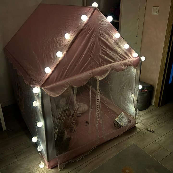 ✔️ lampki w zestawie - namiot zawiera aż 3 metry dekoracyjnych lampek LED – 20 świecących kulek (10 białych i 10 różowych), które tworzą magiczny klimat do zabawy, czytania bajek i zasypiania, lampki są zasilane na baterie AA (brak w zestawie), dzięki czemu działają niezależnie od prądu i możesz je zabrać wszędzie – do ogrodu a nawet na taras